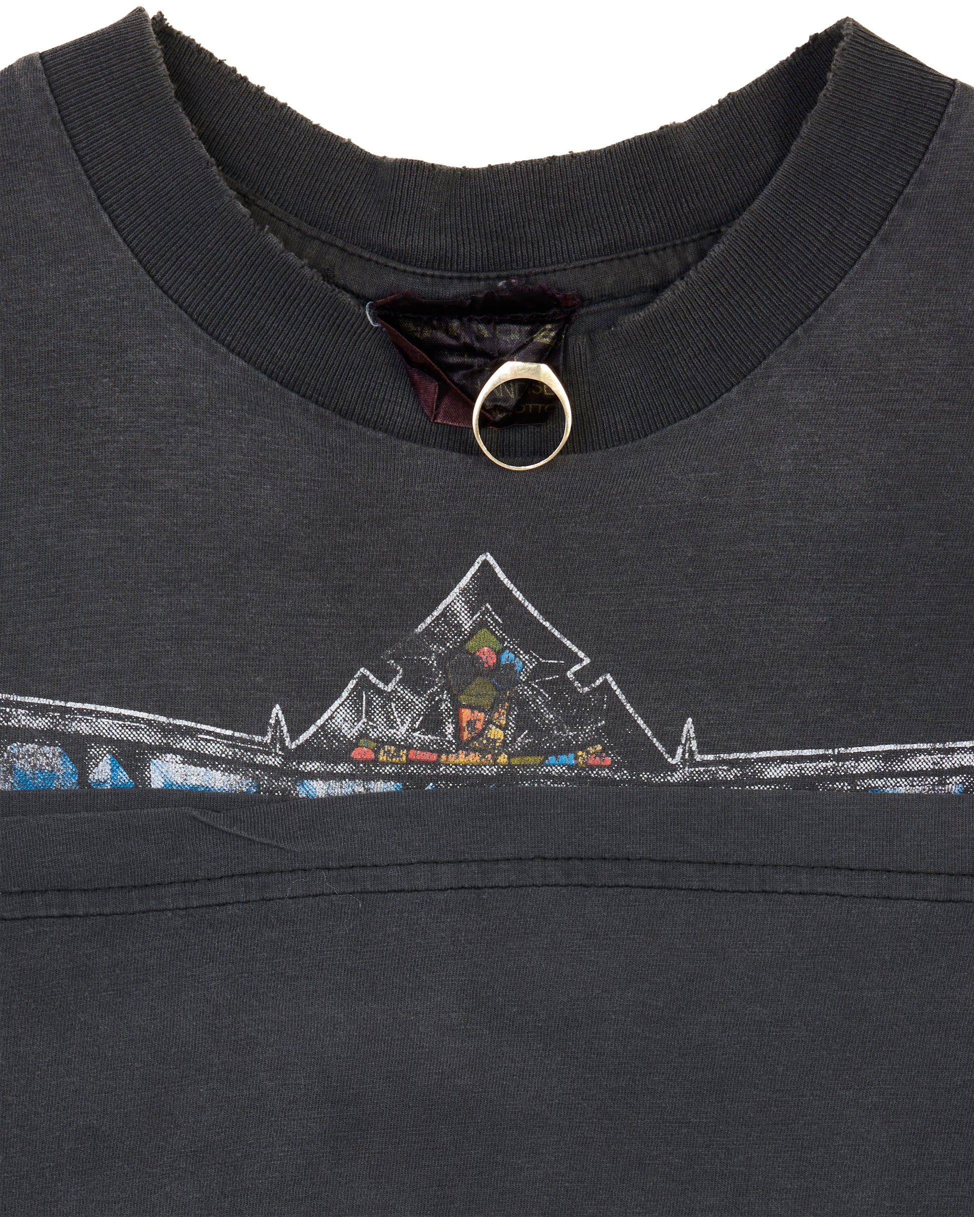 Condition: Fabric and print nicely faded, sleeves were cut off, side seams(possibly tailored), couple holes in the sides of the shirt