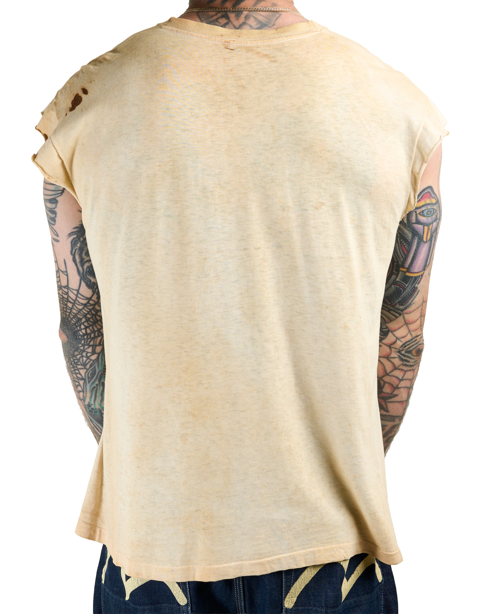 Condition: Sleeves were cut off, discoloration and stains all over the shirt, some blood stains