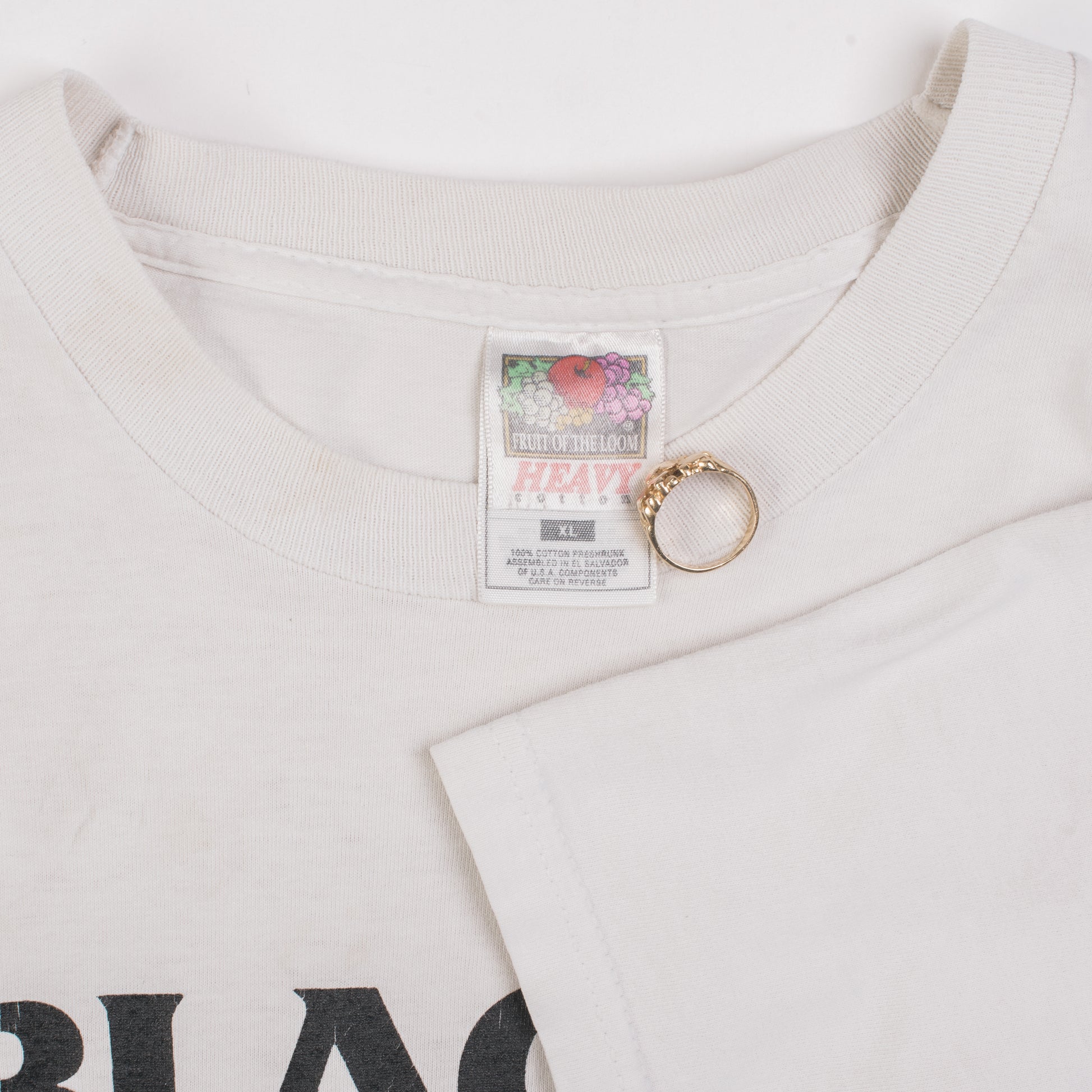 Condition: Discoloration, yellowing, stains and some small holes around the shirt, armpit stains, print is cracking