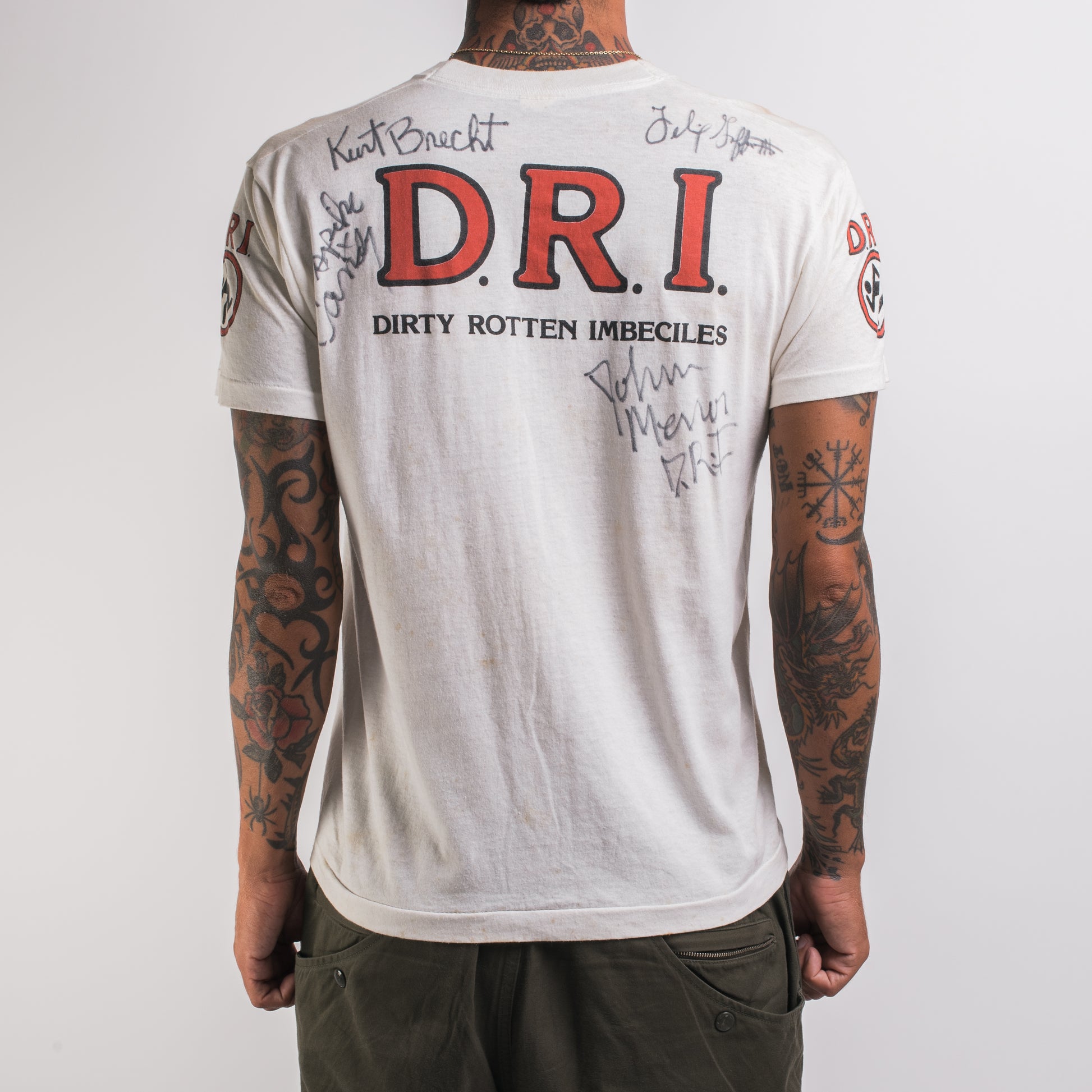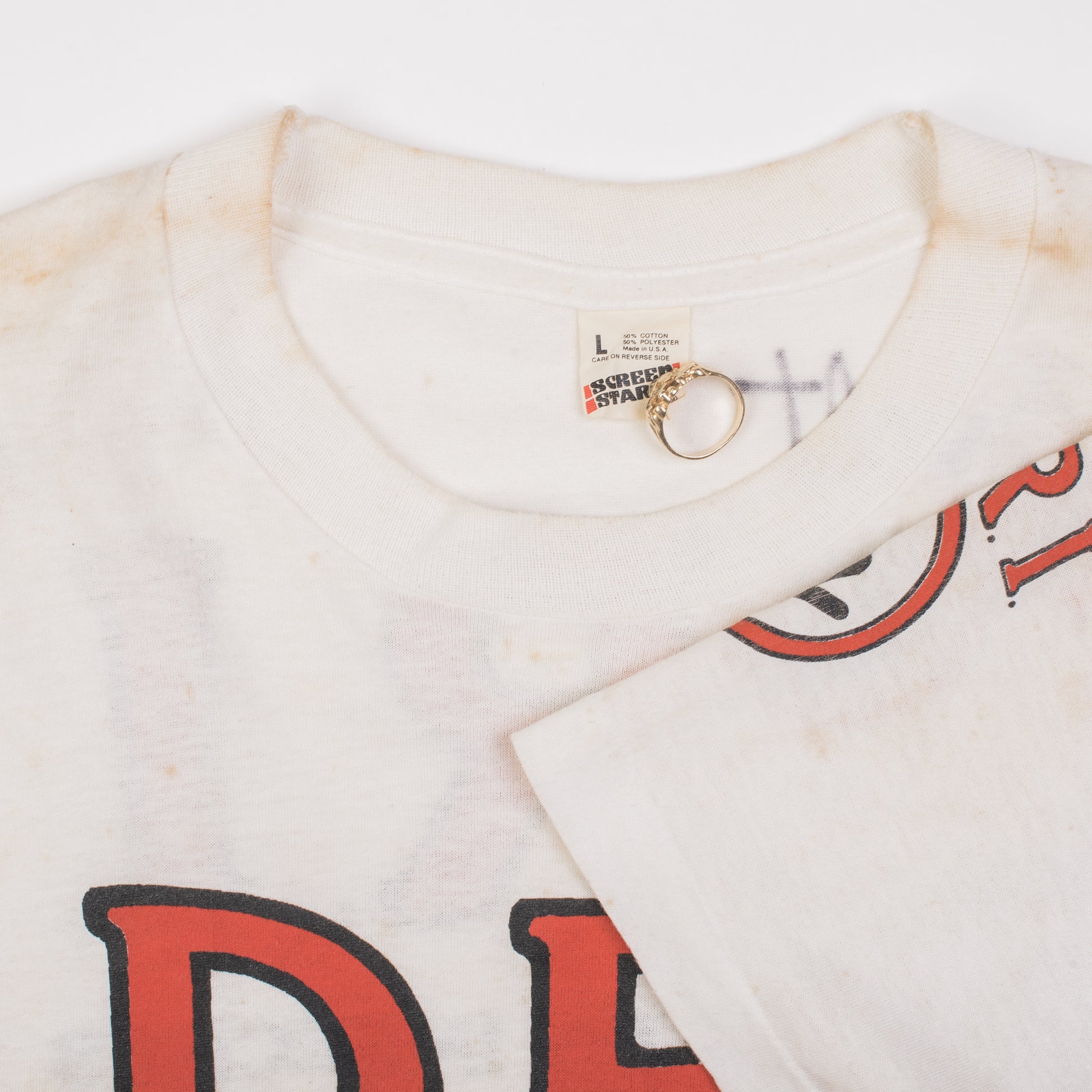 Condition: Yellowing and stains all over the shirt, signed by the band with a sharpie in the top back of the shirt