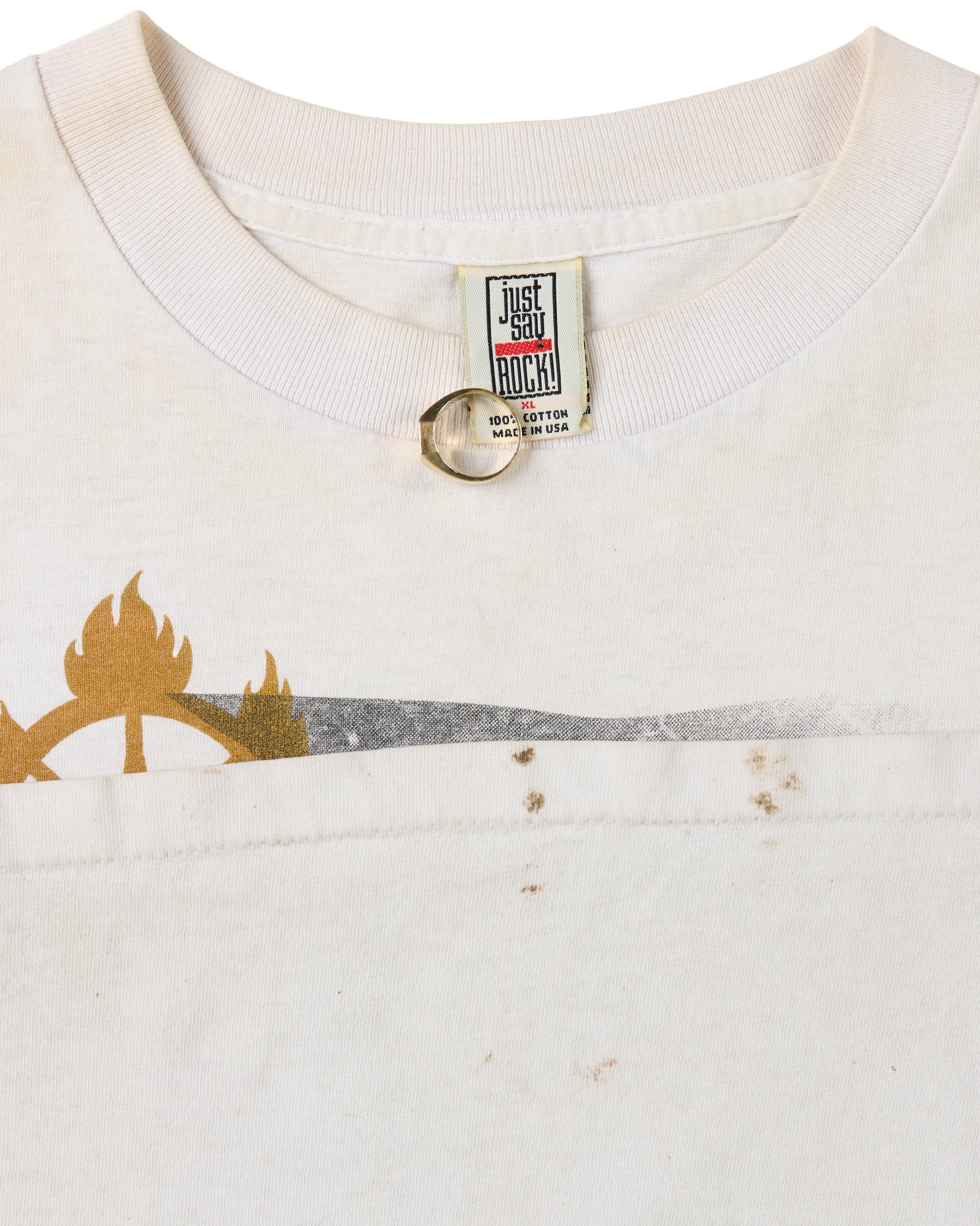 Condition: Discoloration and stains all over the shirt, blood stains on the left sleeve