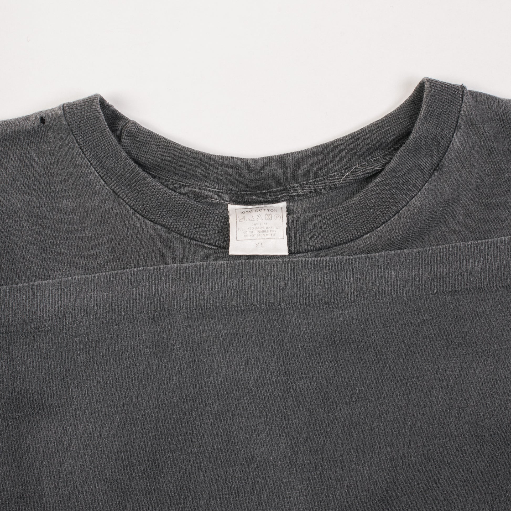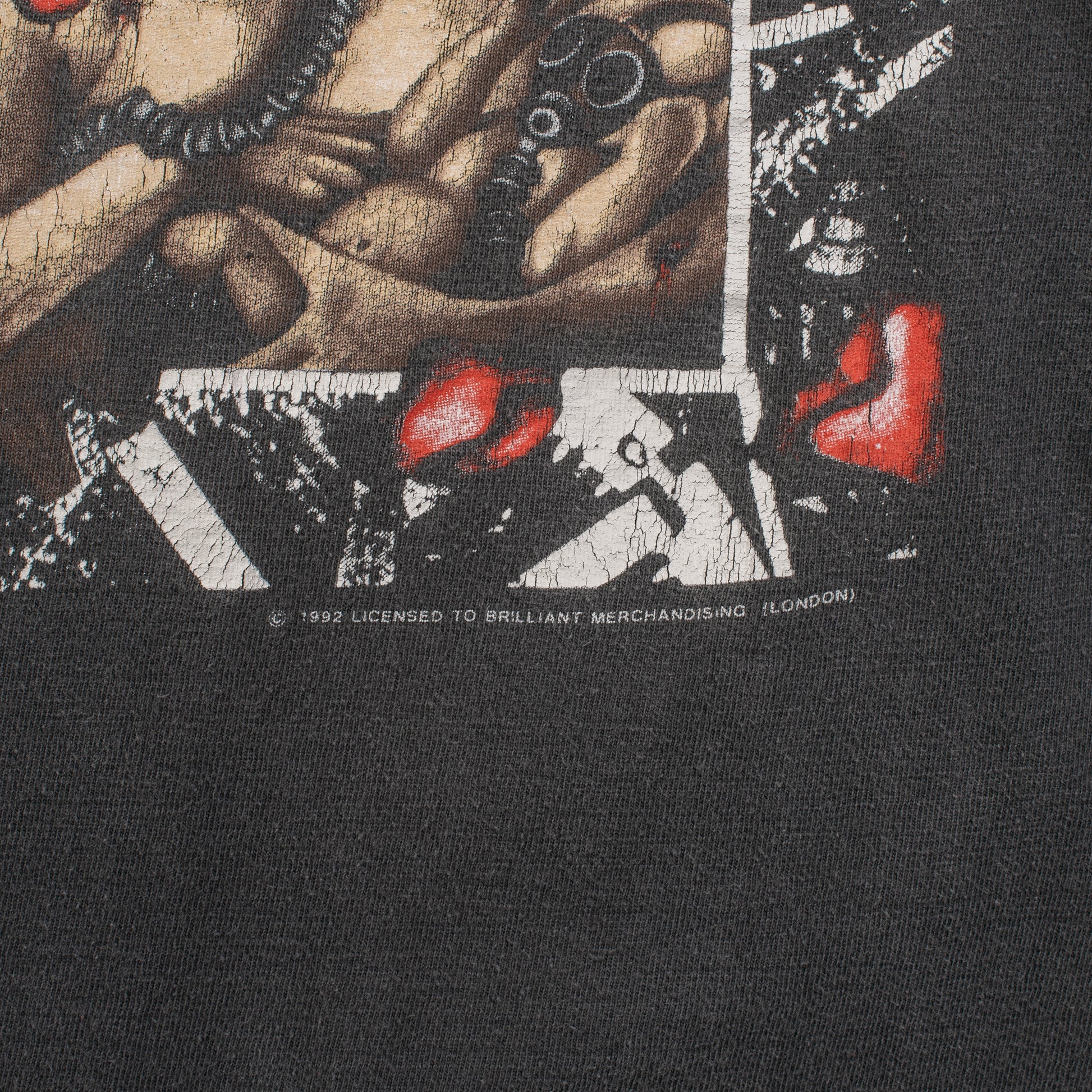 Condition: Fabric and print nicely faded, small hole in the right shoulder, some holes around the sleeves, hole in the right armpit, few pinholes around the shirt