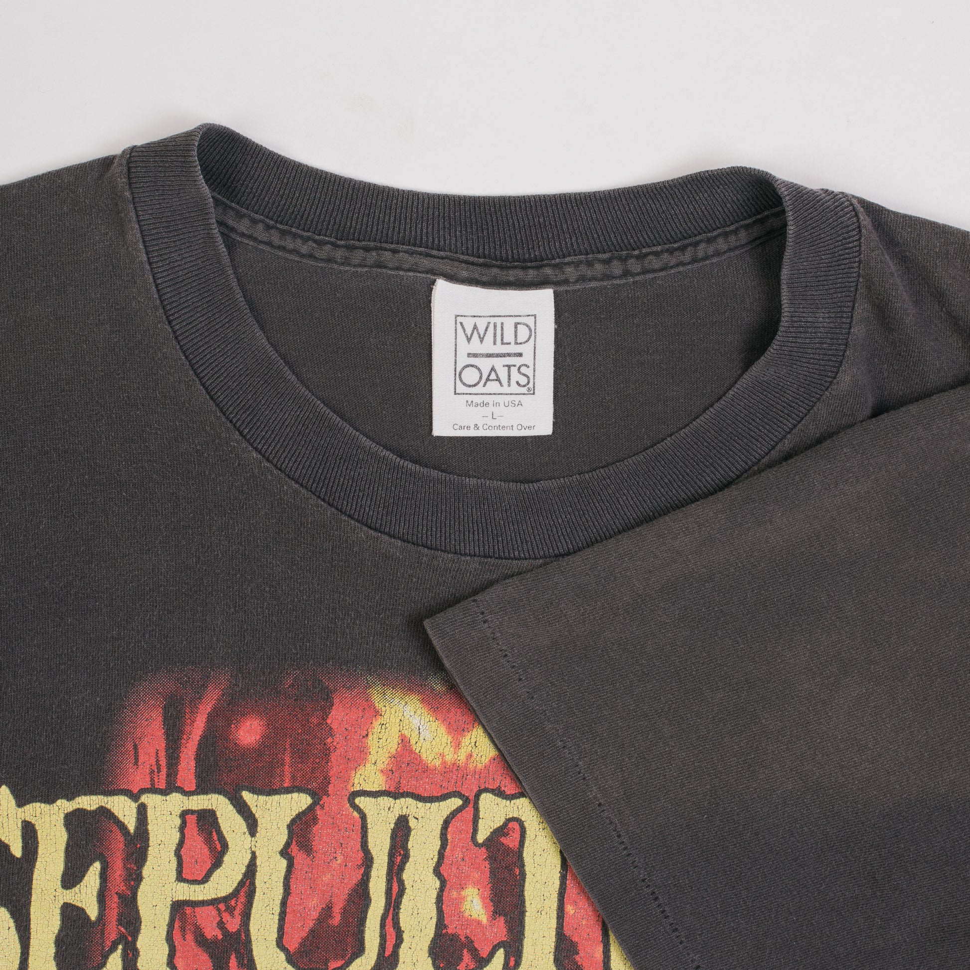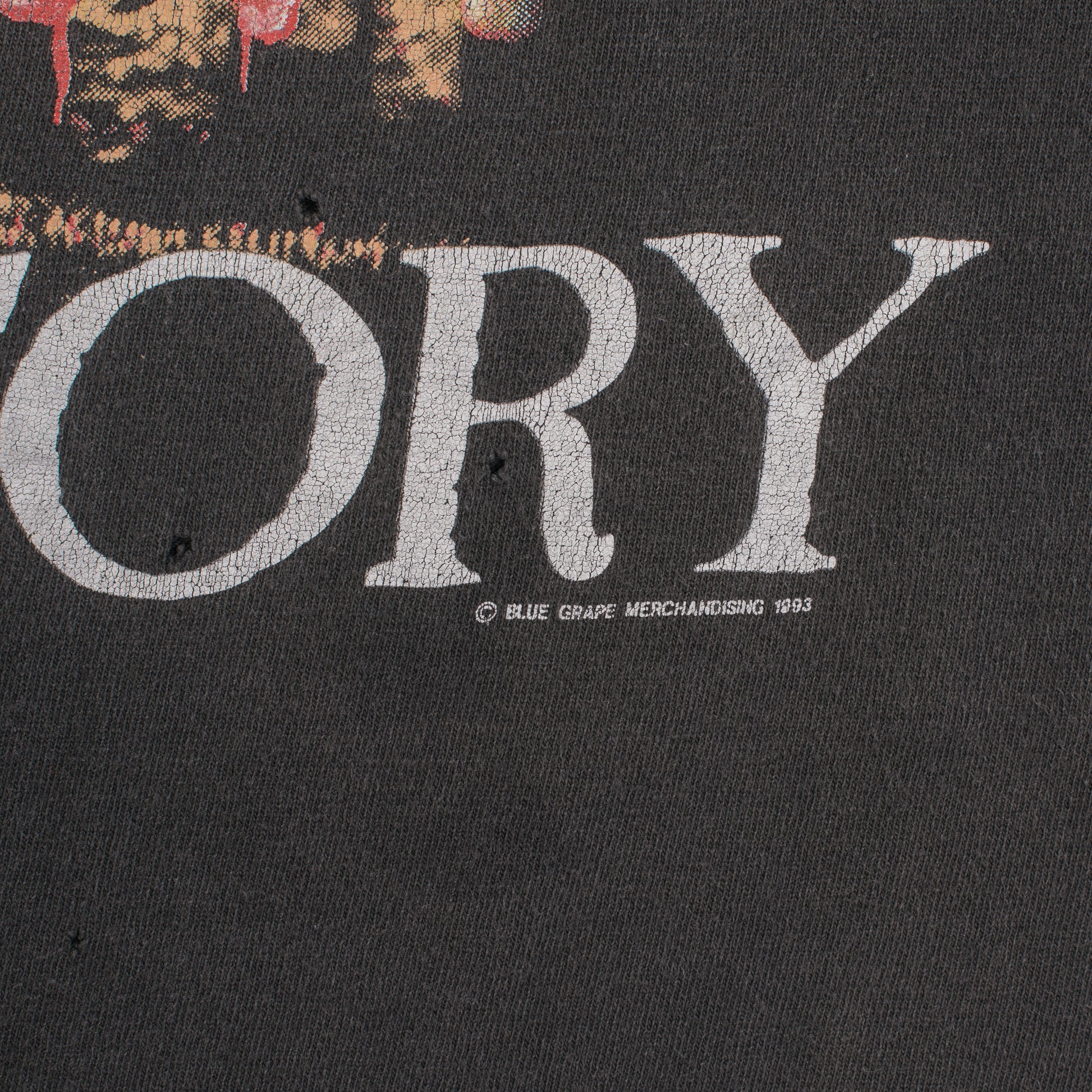 Condition: Fabric nicely faded, several small holes/pinholes around the shirt, print is cracking, collar is stretched out