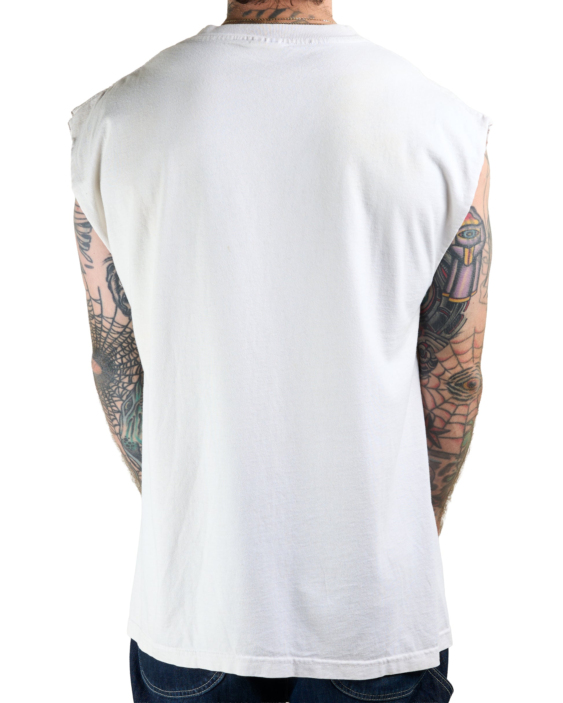 Condition: Sleeves were cut off, discoloration and some stains around the shirt