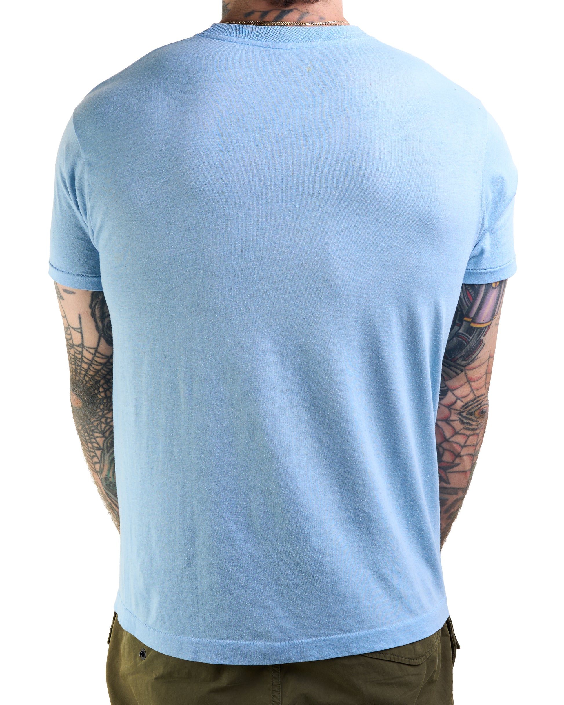 Condition: Fabric nicely faded, some discoloration, stains and pinholes around the shirt