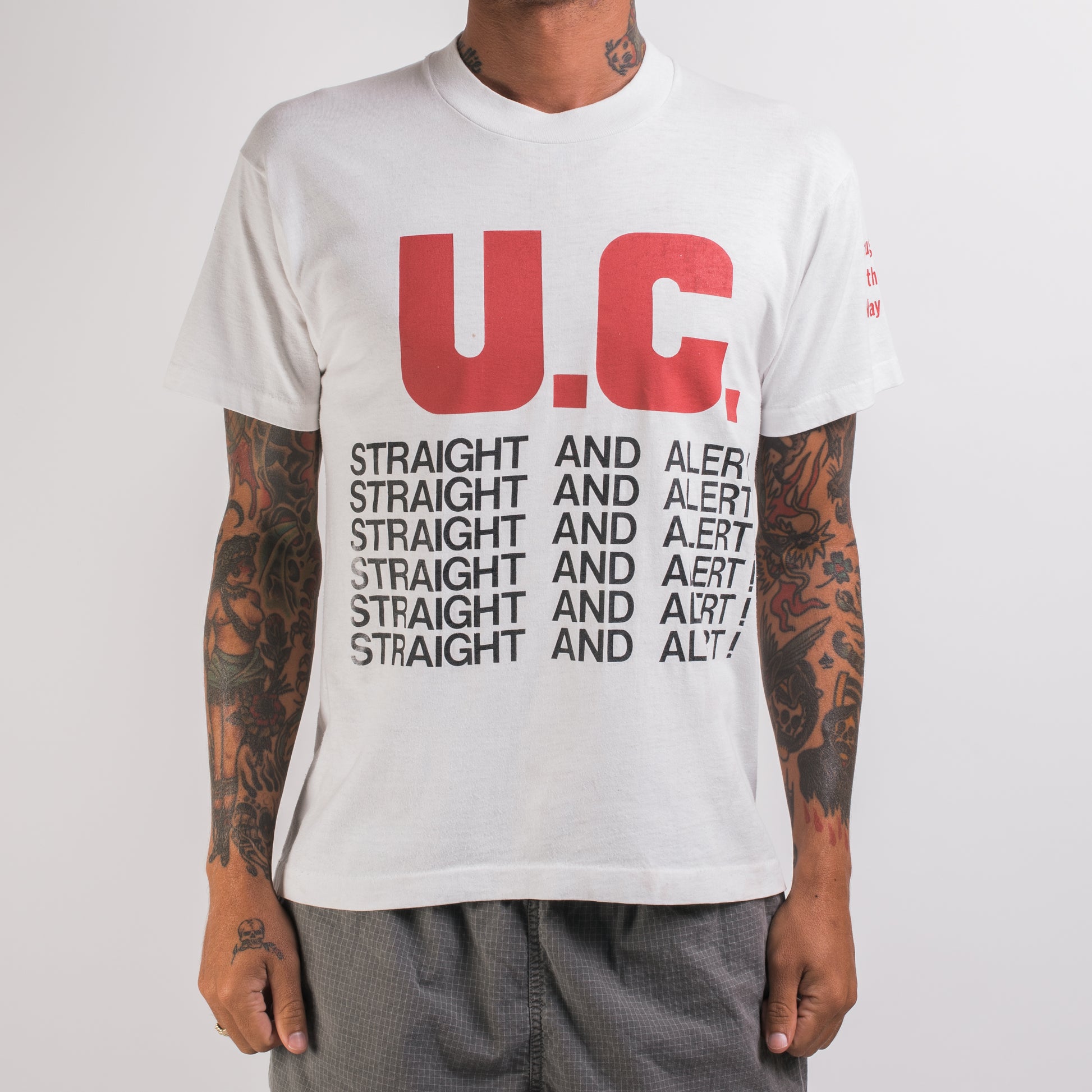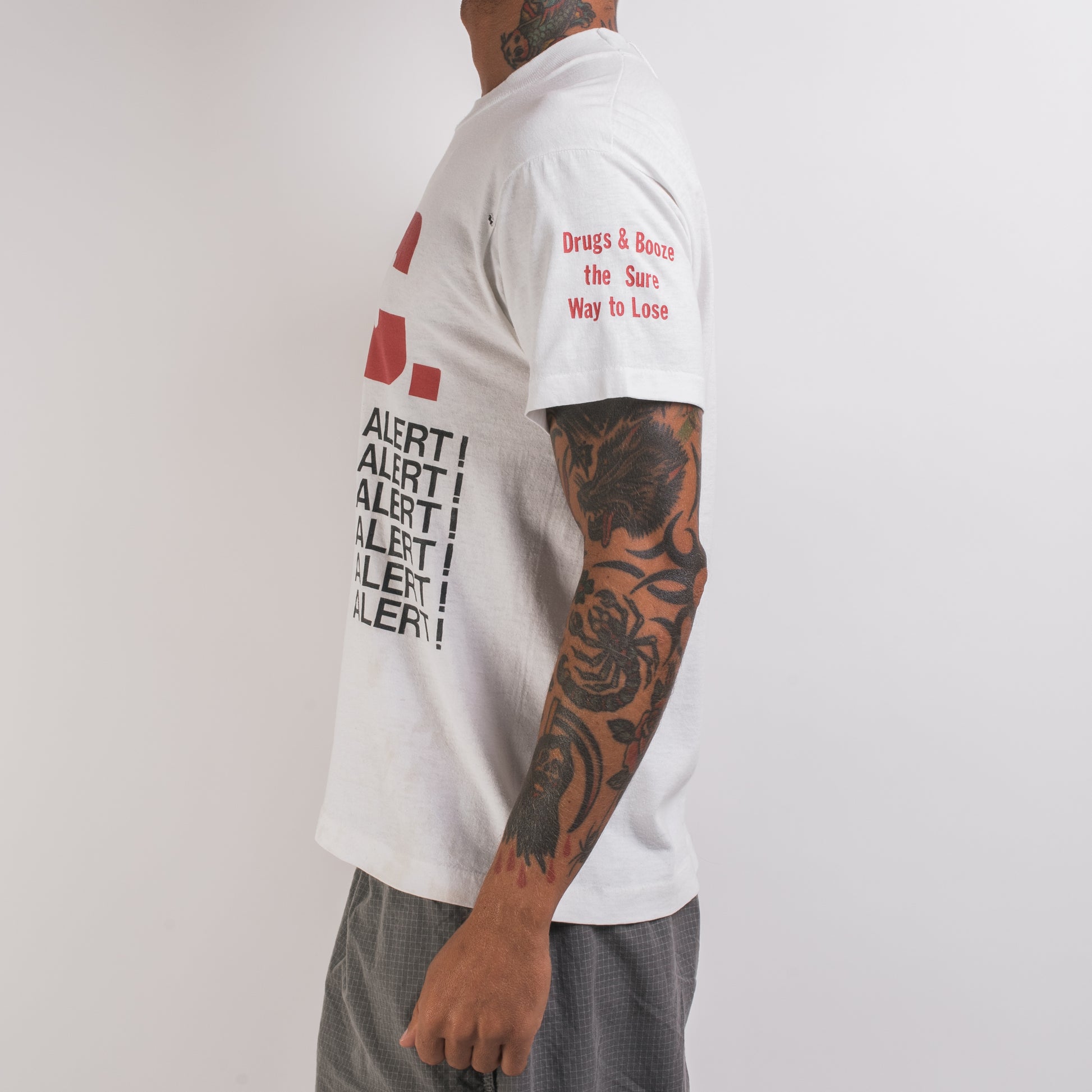 Condition: Several stains around the shirt, hole in the left side of the chest by the sleeve, some light discoloration around the shirt