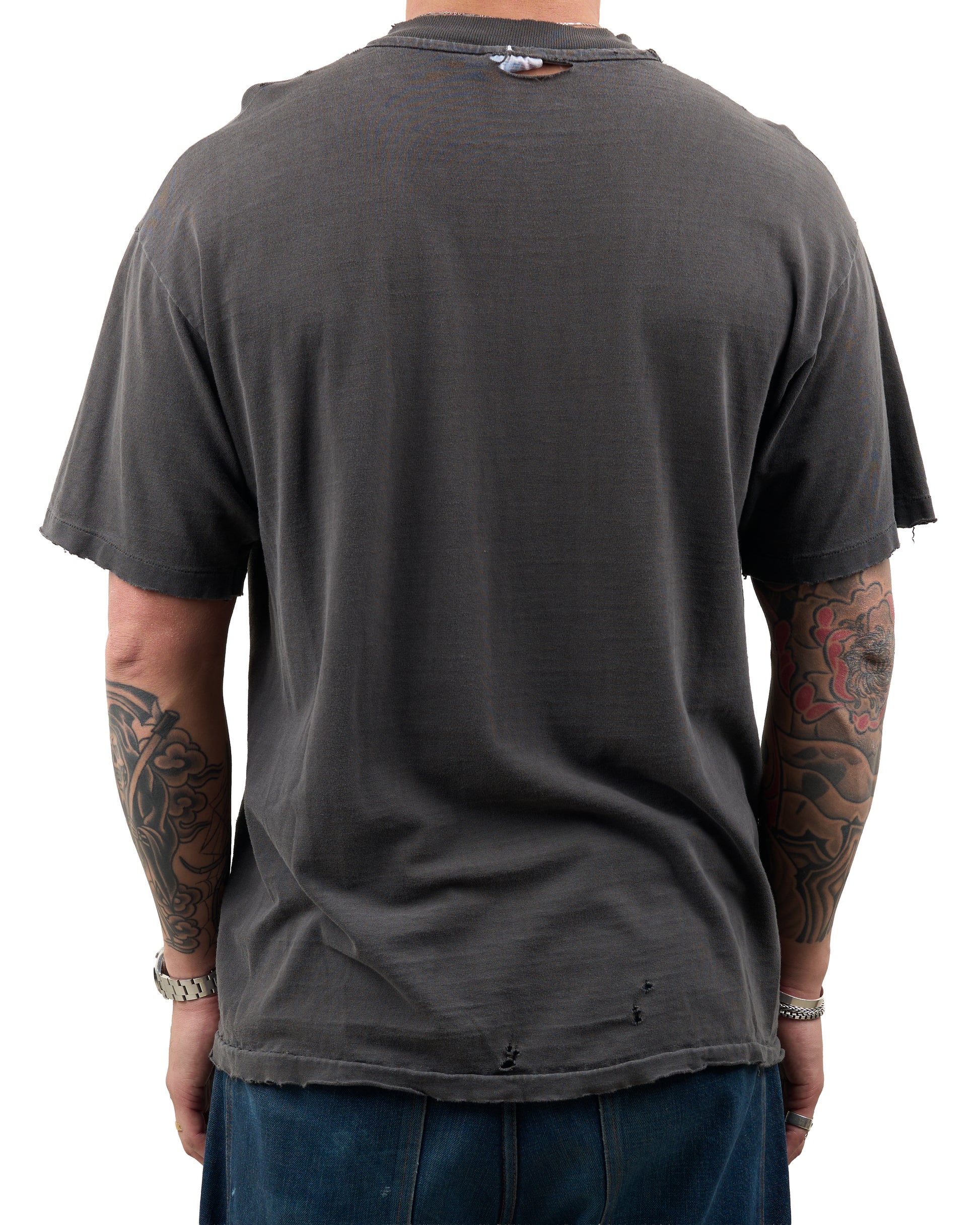 Condition: Nicely distressed and faded, several holes around the shirt, holes in both armpits, collar/hem on the sleeve and bottom hem are nicely frayed