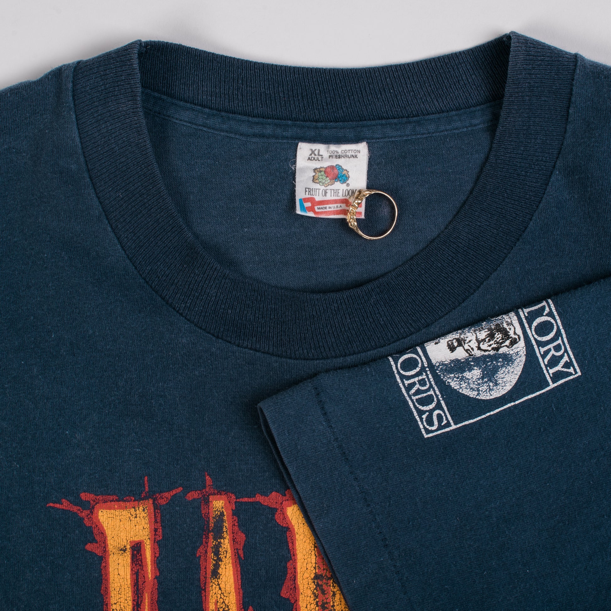 Condition: Fabric and print nicely faded, two pretty big holes in the left shoulder, bleach spot in the front right bottom side of the shirt, hole in the back of the right shoulder
