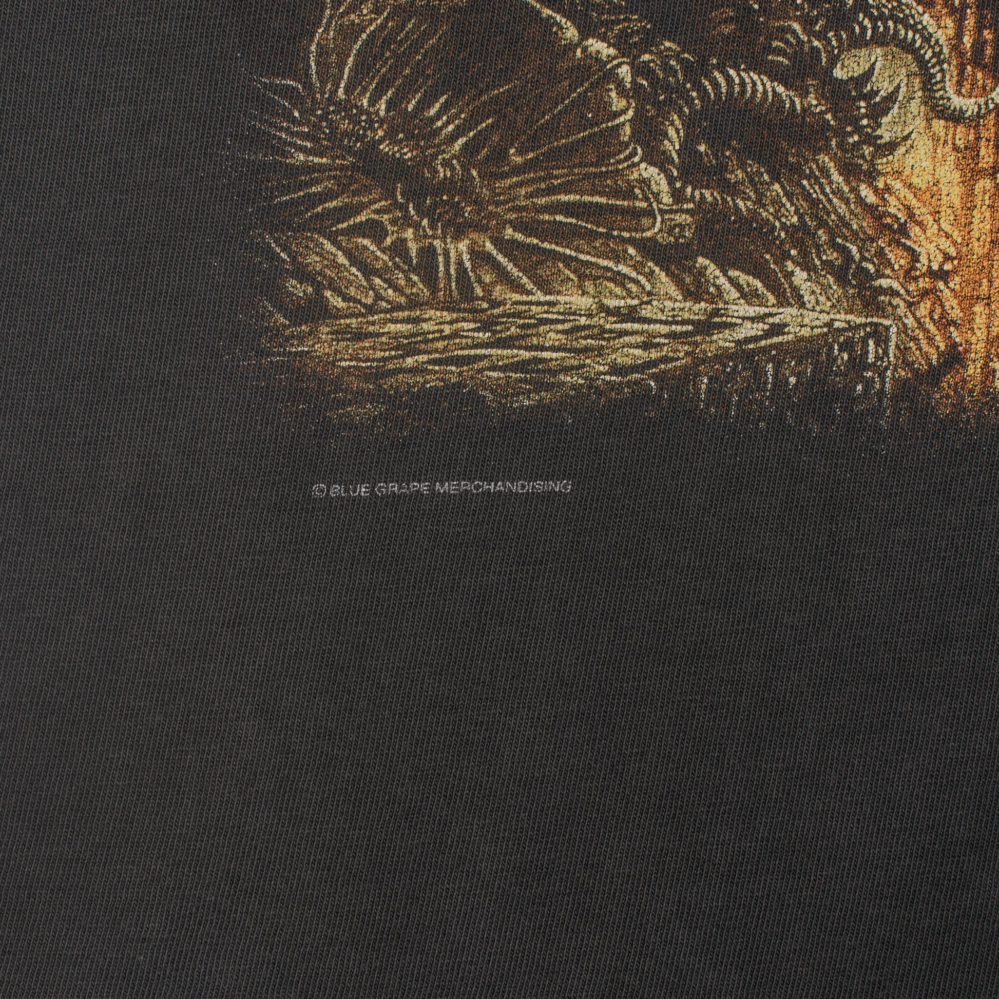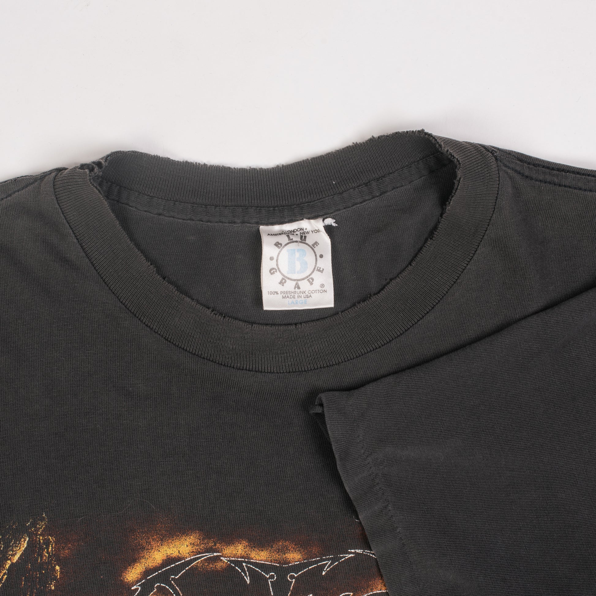 Condition: Fabric and print nicely faded, big hole on the left armpit, hole in the front bottom of the shirt, some pinholes around the shirt, collar and bottom hem are nicely frayed